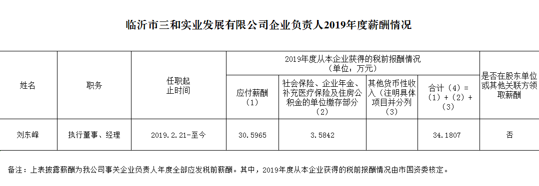 臨沂市三和實業(yè)發(fā)展有限公司企業(yè)負責人2019年度薪酬情況